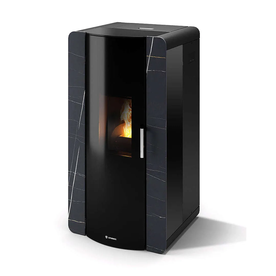 Le Roma 15 de CS Thermos est un thermo-poêle à granulés alliant esthétique soignée et raccordement hydraulique performant. Avec une puissance totale de 7,5 à 15,4 kW — dont jusqu’à 13,6 kW restituée au circuit eau —, il peut chauffer jusqu’à 440 m³ tout en maintenant un rendement de 93,3 %. Son habillage en pierre naturelle (Noir Azalai, Platinum White, Umbra ou Ollaire) avec verre sérigraphié noir et double vitrage lui confère une présence visuelle haut de gamme. Certifié Éco Design 2022, Classe Énergie A++ et équivalent 7 étoiles RT2020.