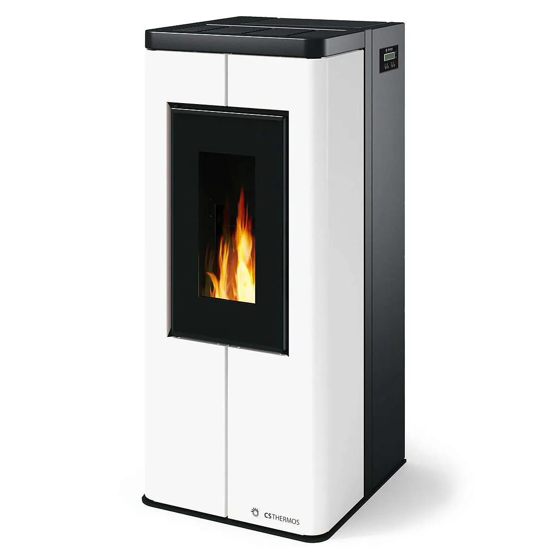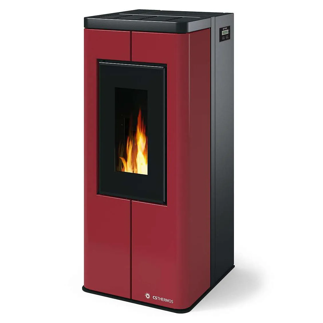 Le Scrigno de CS Thermos se distingue par son design unique à deux portes en coffre et sa porte vitrée sérigraphiée, pour une présence visuelle originale dans l’intérieur. Compact (46 x 49 x 106 cm) et léger (123 kg), il offre un rendement de 90,72 % et une puissance de 3,45 à 8,07 kW pour chauffer jusqu’à 230 m³. Disponible en Rouge, Blanc, Bronze ou Noir, il est certifié Éco Design 2022, Classe Énergie A+ et équivalent 7 étoiles RT2020.