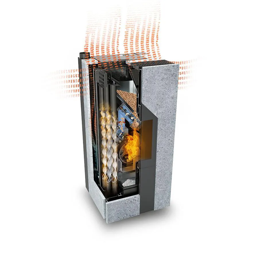 Son brûleur polycombustible autonettoyant breveté accepte 5 types de combustibles préprogrammés et expulse les cendres sans interrompre le fonctionnement. La double bougie d’allumage garantit des démarrages rapides et fiables, tandis que le système anti-retour de flamme et le réservoir hermétique à fermeture magnétique de 20 kg assurent sécurité et autonomie prolongée. À faible puissance, le fonctionnement en convection naturelle silencieuse offre un confort optimal. Canalisable grâce au kit de canalisation dédié (en option), il permet de distribuer la chaleur dans plusieurs pièces. L’évacuation des fumées en sortie arrière ou supérieure (Ø 80 mm) offre une grande souplesse d’installation.