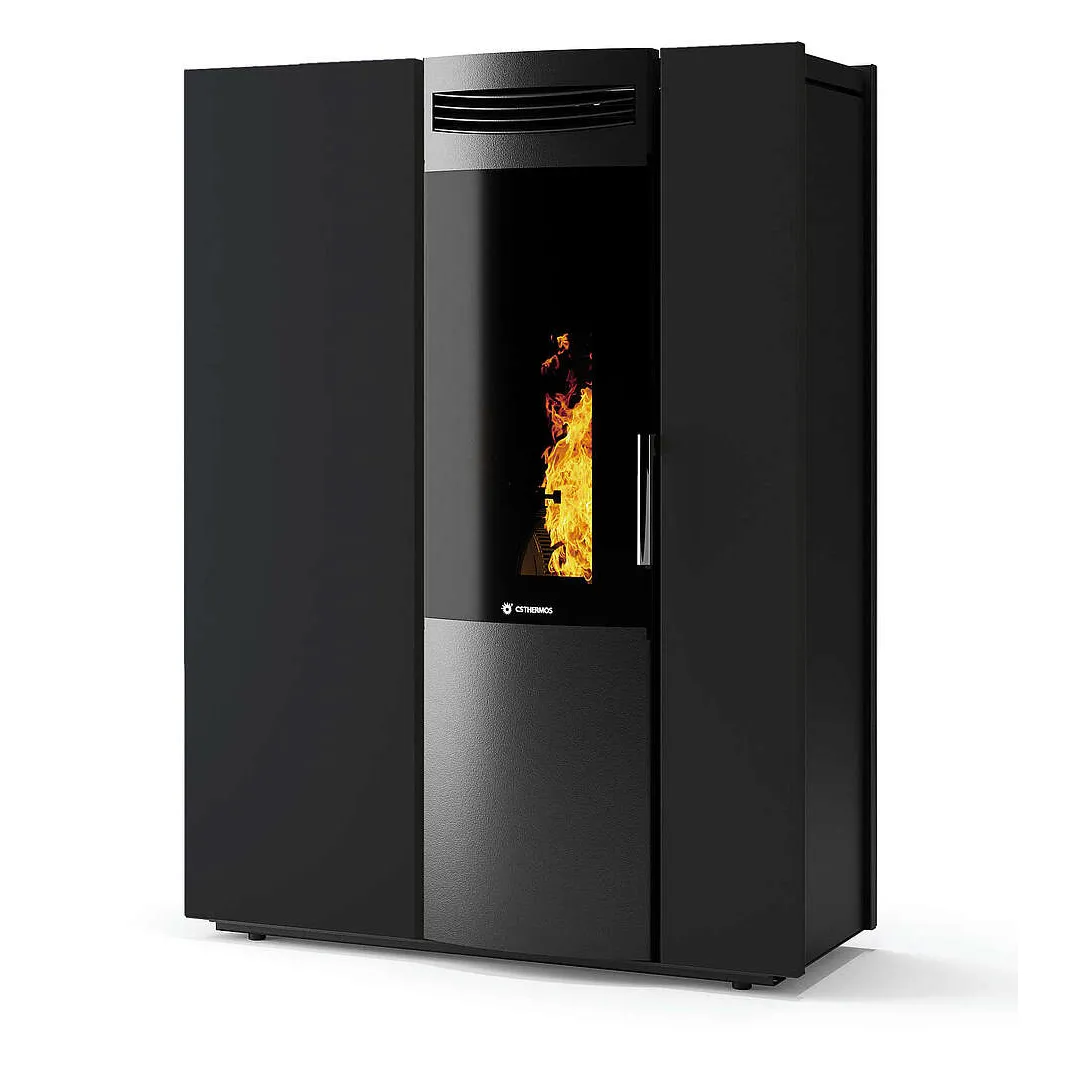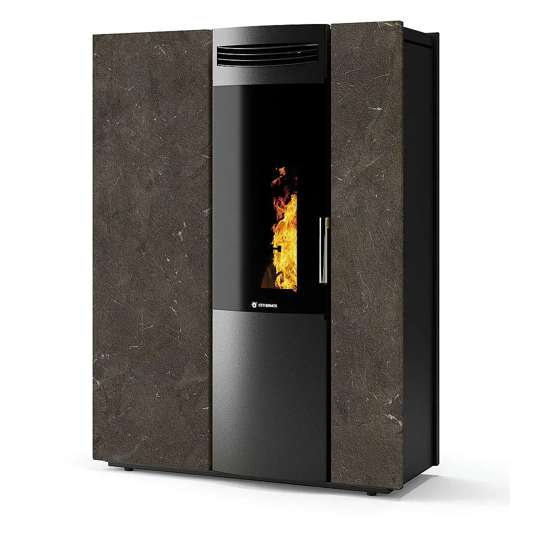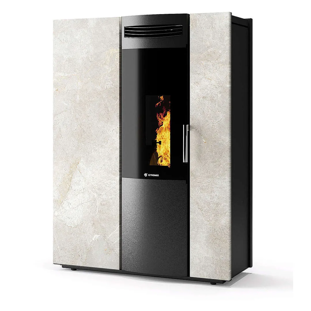 Son vitrage panoramique arrondi associe esthétique soignée et sobriété, tandis que son revêtement en pierre MDi — composée de minéraux purs fondus à haute température — garantit durabilité et inertie thermique. Son brûleur polycombustible autonettoyant breveté accepte 5 types de combustibles préprogrammés et expulse les cendres sans interrompre le fonctionnement. La double bougie d’allumage garantit des démarrages rapides et fiables, tandis que le système anti-retour de flamme et le réservoir hermétique de 18 kg assurent sécurité et praticité au quotidien. Canalisable grâce au kit de ventilation dédié (en option), il permet de distribuer la chaleur dans plusieurs pièces. L’évacuation des fumées en sortie arrière ou supérieure (Ø 80 mm) offre une grande souplesse d’installation.